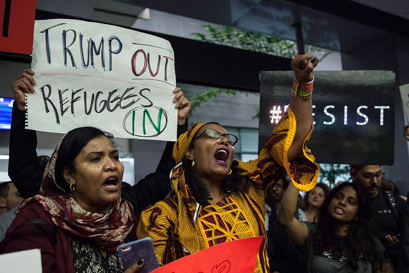 13.01.2018Varias mujeres protestan en el Aeropuerto Internacional de San Francisco tras el veto temporal a la entrada de ciudadanos de varios países de mayoría musulmana decretado por el presidente de EE.UU. Donald Trump firmó la primera versión de su polémico veto a finales de enero de 2017.PETER DASILVA