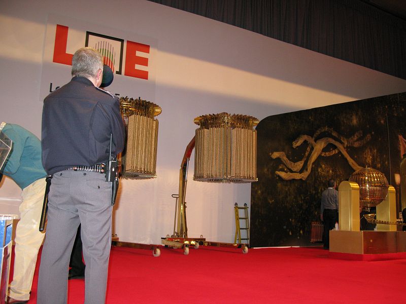 • Personal del Organismo de Loterías comprueba que el mecanismo de la tolva funciona correctamente.