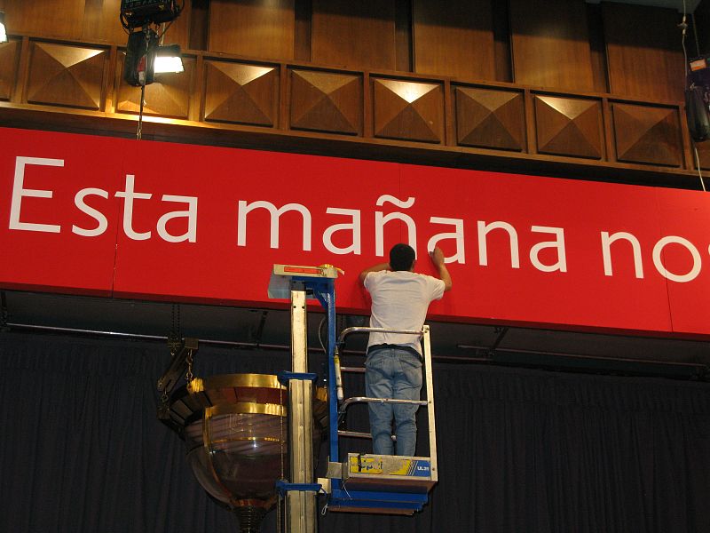 • Un operario comprueba que estén bien pegadas las letras de lema que reza sobre el escenario del sorteo: "Esta mañana nos visita la diosa Fortuna".