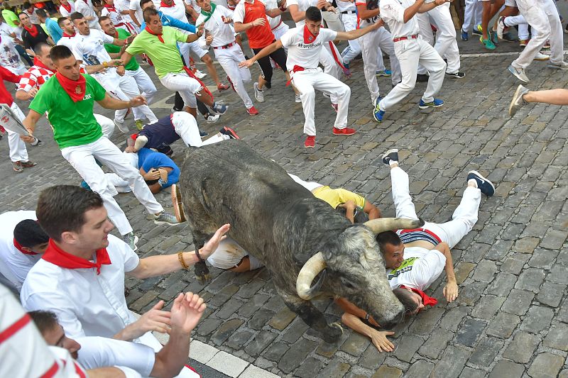 09.07.2018La caída de varios corredores provoca un pequeño montón en el tramo de Telefónica en el tercer encierro de los Cebada Gago que han protagonizado el recorrido más veloz hasta el momento con 3 minutos y 33 segundos.AFP/ANDER GILLENEA