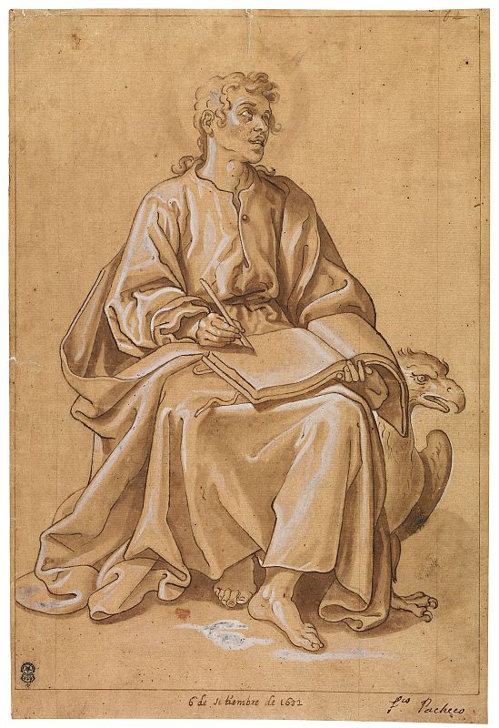 • San Juan Evangelista Francisco Pacheco Pluma y tinta marrón oscura, aguada parda con realces de albayalde sobre lápiz negro, 330 x 222 mm 1632 © The Trustees of the British Museum 1928,0714.1