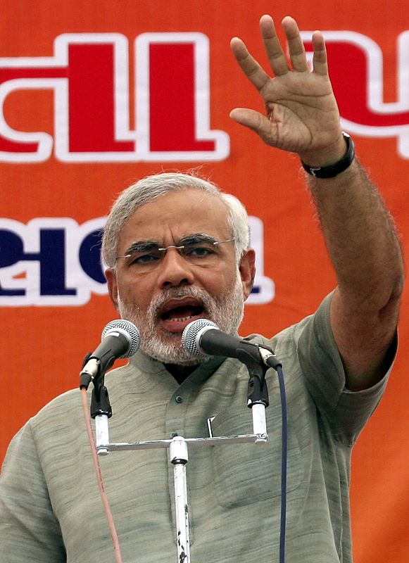16.04.2009Gujarat's Chief Minister Narendra Modi speaks during an election campaign rally in Balasinor, about 90 km (56 miles) east of the western Indian city of Ahmedabad, April 14, 2009. India will hold a general election between April 16 and May 13. REUTERS/Amit Dave (INDIA POLITICS ELECTIONS HEADSHOT)REUTERS/Amit Dave