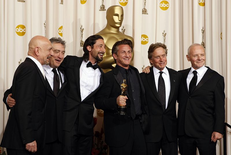 Sean Penn posa, con su preciado Oscar, acompañado de los actores Kingsley, De Niro, Brody, Douglas y Hopkins en el backstage