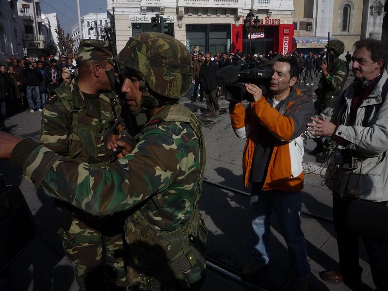 26.01.2011Carlos Dias Oliván y Juan Antonio Barroso rodando una manifestación en el bulevar Bourghiba, en Túnez.José Jiménez