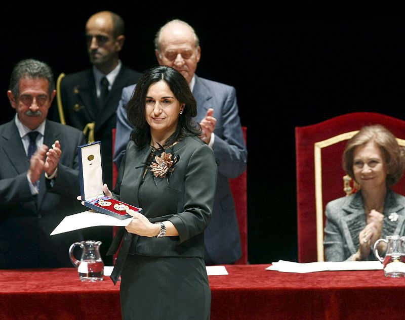 27.10.2009La directora de Comunicación de la Fundación BBVA, Silvia Ana Churruca, muestra la Medalla de Oro a las Bellas Artes concedida a la entidad en reconocimiento a sus acciones de mecenazgo, en una ceremonia de las Bellas Artes celabrada esta mañana el Palacio de Festivales de Santander y presidida por los Reyes de España en Santander. (27/10/09)EFE/Esteban Cobo