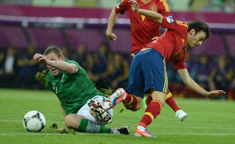 14.06.2012El jugador de Irlanda, Richard Dunne, lucha un balón con Daavid SilvaAFP