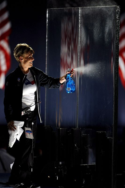 04.11.2008MCX03 - CHICAGO (ESTADOS UNIDOS), 04/11/08.- Una mujer limpia las ventanas a prueba de balas en el escenario donde el candidato presidencial demócrata, el senador Barack Obama, hablará ante sus seguidores en el Grant Park de Chicago, Illinois (EEUU), hoy, 4 de noviembre de 2008, durante las elecciones presidenciales de Estados Unidos, en las que compiten los candidatos, Obama, y el republicano, John McCain. EFE/TANNEN MAURYEFE/TANNEN MAURY