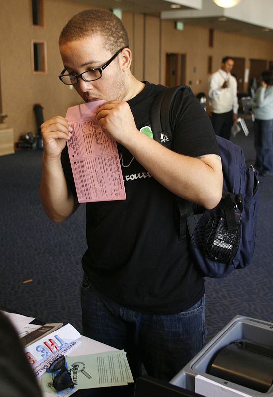 Un estudiante de la Universidad de California en Los Ángeles (UCLA), Richard Stevenson, vota en su campus. Al no estar su nombre en las listas tuvo que votar con una papeleta provisional. (04/11/08)