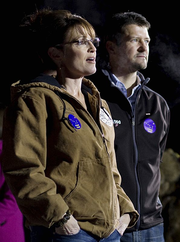 U.S. Republican vice presidential nominee Alaska Gov. Sarah Palin talks with the press outside the polling station at Wasilla City Hall with husband, Todd, after casting her vote in Wasilla, Alaska, November 4, 2008. REUTERS/Nathaniel Wilder (UNITED STATES) US PRESIDENTIAL ELECTION CAMPAIGN 2008 (USA)