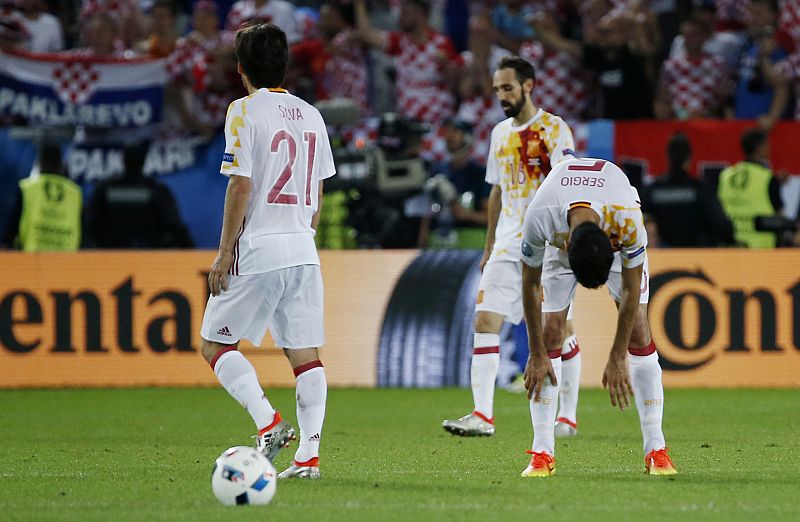 Gestos de desolación de los jugadores de España tras el gol de Perisic