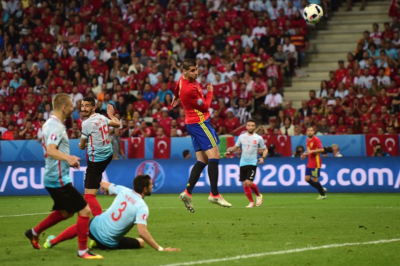 Morata conecta el cabezazo que supone el 1-0 de España