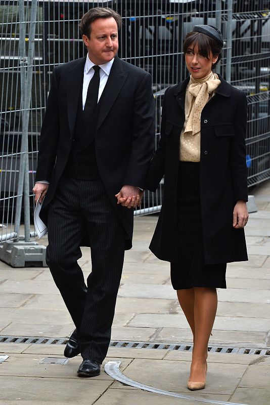 17.04.2013El primer ministro británico David Cameron y su mujer, Samantha, a su llegada a la Catedral de San Pablo para asistir al funeral de la ex primera ministra Margaret Thatcher en Londres (Reino Unido) hoy, miércoles 17 de abril de 2013. El ataúd con los restos mortales de la ex primera ministra británica Margaret Thatcher llegó hoy a la catedral de San Pablo donde se oficiará el funeral con honores militares en presencia de la reina Isabel II.EFE/ John Stillwell