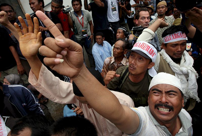 09.11.2008MAS122 LAMONGAN (INDONESIA), 08/11/08.- Centenares de seguidores de los islamistas ejecutados esta madrugada por los atentados de Bali de 2002, donde murieron 202 personas, lloran y gritan lemas durante una concentración para recibir sus cuerpos en Tenggulun, Lamongan (Indonesia), la localidad natal de los dos hermanos fusilados, Amrozi y Ali Gufron, hoy domingo 09 de noviembre. Amrozi, Ali Gufron e Imam Samudra fueron condenados a la pena capital en octubre del 2003 y, tras seis años de batalla judicial, habían agotado sin éxito todos los recursos legales. Indonesia decidió transportar en helicóptero los cadáveres de los tres ejecutados para evitar una procesión por tierra que atraiga a seguidores de los extremistasEFE/MAST IRHAMEFE