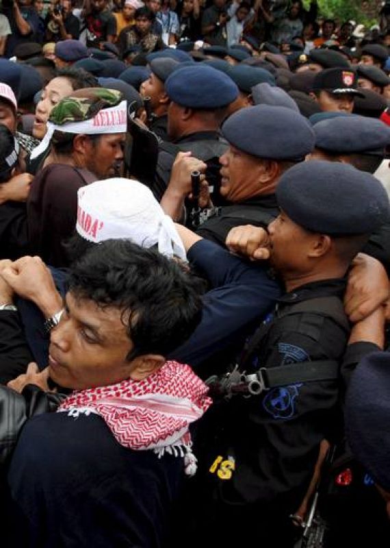 09.11.2008MAS123 LAMONGAN (INDONESIA), 08/11/08.- Centenares de seguidores de los islamistas ejecutados esta madrugada por los atentados de Bali de 2002, donde murieron 202 personas, se enfrentan con la policía durante una concentración para recibir sus cuerpos en Tenggulun, Lamongan (Indonesia), la localidad natal de los dos hermanos fusilados, Amrozi y Ali Gufron, hoy domingo 09 de noviembre. Amrozi, Ali Gufron e Imam Samudra fueron condenados a la pena capital en octubre del 2003 y, tras seis años de batalla judicial, habían agotado sin éxito todos los recursos legales. Indonesia decidió transportar en helicóptero los cadáveres de los tres ejecutados para evitar una procesión por tierra que atraiga a seguidores de los extremistasEFE/MAST IRHAMEFE -