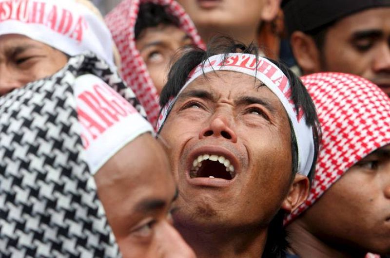 09.11.2008MAS116 LAMONGAN (INDONESIA), 08/11/08.- Centenares de seguidores de los islamistas ejecutados esta madrugada por los atentados de Bali de 2002, donde murieron 202 personas, gritan lemas durante una concentración para recibir sus cuerpos en Tenggulun, Lamongan (Indonesia), la localidad natal de los dos hermanos fusilados, Amrozi y Ali Gufron, hoy domingo 09 de noviembre. Amrozi, Ali Gufron e Imam Samudra fueron condenados a la pena capital en octubre del 2003 y, tras seis años de batalla judicial, habían agotado sin éxito todos los recursos legales. Indonesia decidió transportar en helicóptero los cadáveres de los tres ejecutados para evitar una procesión por tierra que atraiga a seguidores de los extremistasEFE/MAST IRHAMEFE -