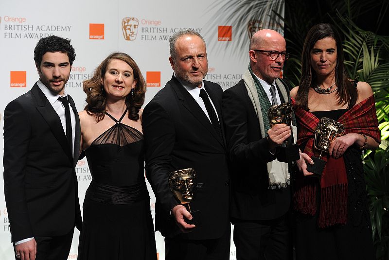 DEM40- LONDRES (REINO UNIDO), 21/02/2010.-Miembros del reparto de la película francesa "The Prophet", incluyendo su protagonista Tahar Rahim (i) y el director francés Jacques Audiard (2 d), posan con el premio a Mejor Película en habla no inglesa hoy, domingo 21 de febrero de 2010, durante la gala de entrega de los premios de la Academia del Cine y la Televisión británica, Bafta, celebrada en la Royal Opera House de Londres Reino Unido. EFE/ DANIEL DEME