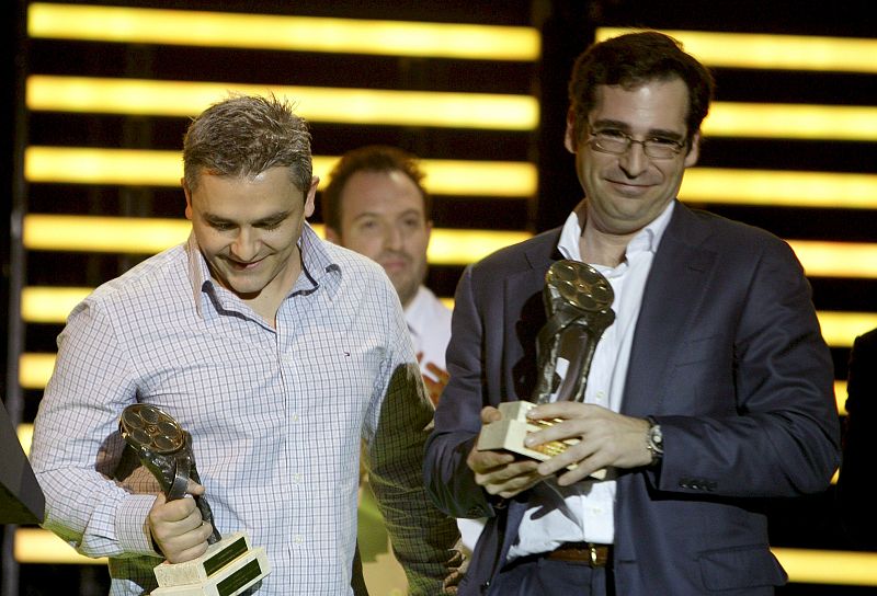 MD112. MADRID, 28/01/2010.- El director y el productor de la película española de animación "Planet 51", Jorge Blanco (i) e Ignacio Pérez (d), respectivamente, tras recoger el premio especial EGEDA al mejor largometraje documental o de animación, durante la Gala del Premio Cinematográfico José María Forqué, celebrada esta noche en el Palacio de Congresos de Madrid.