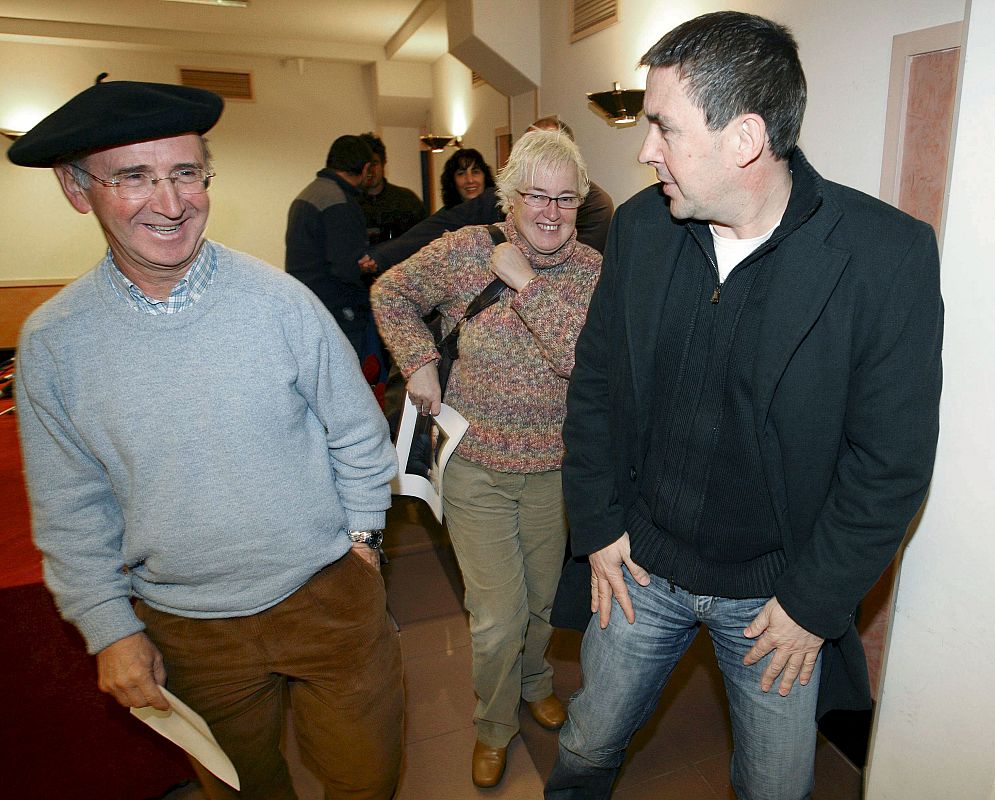 23.01.2009MD109. MADRID, 23/01/09.- Fotografía de archivo tomada el 07/01/09 de los portavoces de la izquierda radical abertzale Arantza Urkaregi (c) y Tasio Erkizia (i), cuyos domicilios han sido registrados esta noche por agentes del Cuerpo Nacional de Policía por orden del juez Baltasar Garzón por su presunta colaboración con partidos ilegalizados. En la imagen Arantza Urkaregi (c) y Tasio Erkizia aparecen junto al ex portavoz de Batasuna Arnaldo Otegi (d) tras ofrecer una conferencia de prensa en San Sebastián. EFE/Archivo/Juan HerreroEFE/Archivo/Juan Herrero