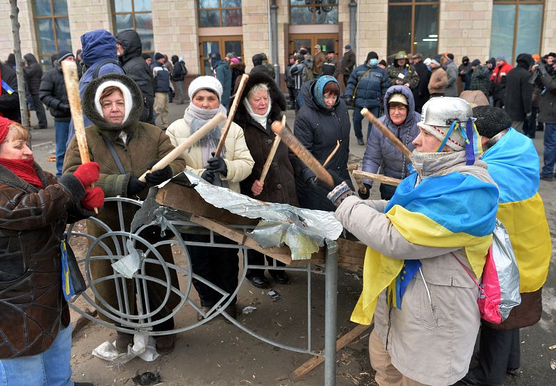 20.01.2014Elderly protesters make noise during clashes between opposition protesters and police in Kiev on January 20, 2014. Radical opposition protesters Monday battled Ukrainian police in new clashes after bloody fighting the day earlier wounded over 200 people amid mounting fury over draconian new anti-protest laws. The clashes, the worst in Kiev in recent times, marked a spiralling of tensions after two months of demonstrations against President Viktor Yanukovych's refusal to sign a pact for closer integration with the EU. AFP PHOTO/ SERGEI SUPINSKYAFP PHOTO/ SERGEI SUPINSKY