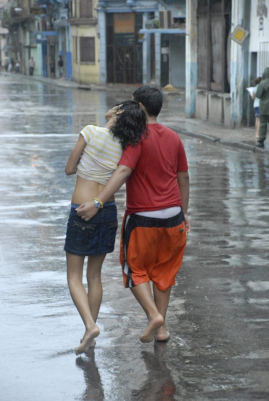 HAB41. LA HABANA (CUBA), 30/08/08.- Dos jóvenes caminan bajo la lluvia tras el paso del Huracán Gustav por La Habana (Cuba) hoy, 30 de agosto de 2008. "Gustav" se aproxima al occidente del país en categoría cuatro, con vientos superiores a 200 kilómetros por hora. EFE/Rolando Pujol