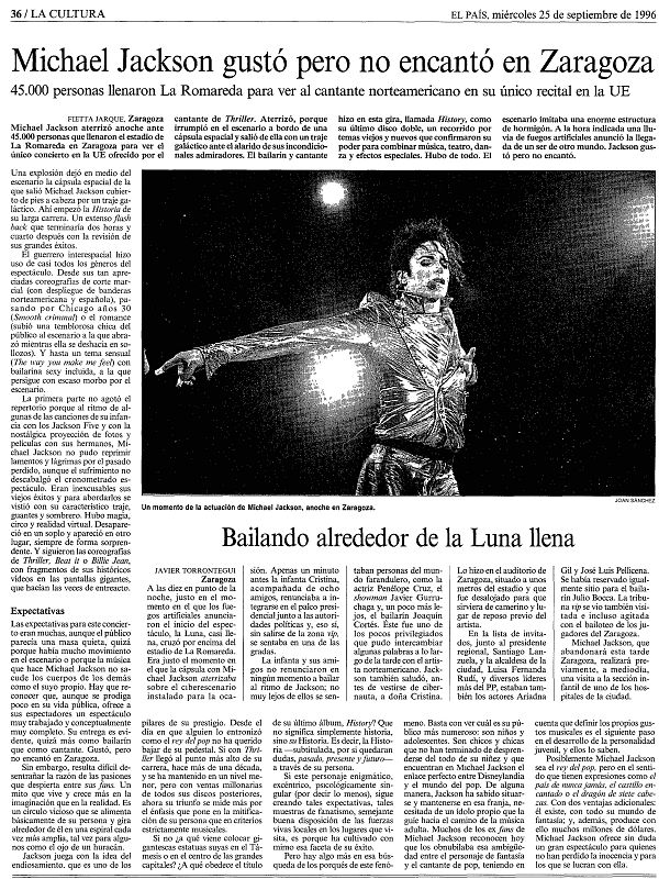 El 24 de septiembre del 96 Jackson volvió a España. Esta vez actuaba en Zaragoza y llenaba el estadio de La Romaleda. Crónica del diario El País.
