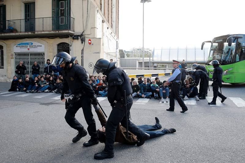 08.11.2017Dos agentes de los Mossos d'Esquadra arrastran a un miembro de un piquete que intentaba bloquear el acceso a la terminar de autobuses de la Estación del Norte en Barcelona.AFP PHOTO/ PAU BARRENA -