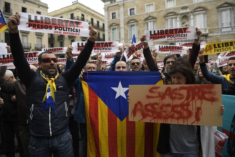 08.11.2017Un grupo de gente piden la libertad para "los presos políticos" catalanes en la Plaza de Sant Jaume en el centro de Barcelona. Una mujer sostiene un cartón en el que se lee "Sastre asesino" en referencia al pasado como terrorista en Terra Lliure de Carlos Sastre, secretario general de la Intersindical-CSC (sindicato convocante de la huelga general en Cataluña).LLUIS GENE -