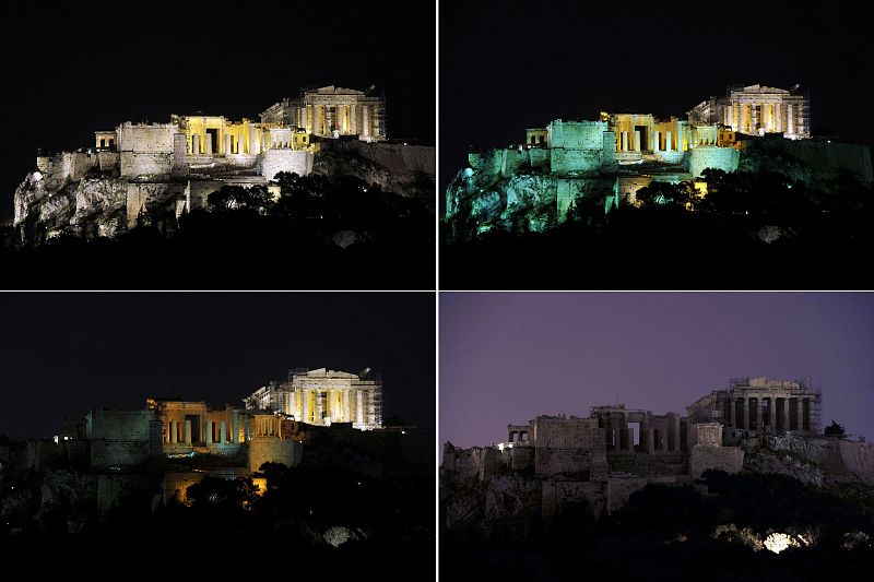 31.03.2012This combo of pictures shows the Athens landmark Acropolis hill with the lights on and with the lights off (bottom-R) during the 'earth hour' on March 31, 2012 in Athens. Millions of people were expected to switch off their lights for Earth Hour on March 31 in a global effort to raise awareness about climate change that was even to be monitored from space. TOPSHOTS/AFP PHOTO/LOUISA GOULIAMAKITOPSHOTS/AFP PHOTO/LOUISA GOULIAMAKI