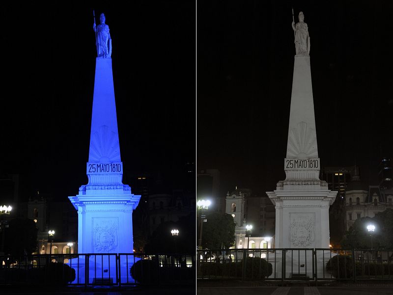 31.03.2012This combo of pictures shows Buenos Aires' Piramide de Mayo with the lights on (L) and with the lights off (R) during the annual Earth Hour event on March 31, 2012. Millions of people were expected to switch off their lights for Earth Hour on March 31 in a global effort to raise awareness about climate change that was even to be monitored from space. AFP PHOTO / Alejandro PAGNIAFP PHOTO / Alejandro PAGNI