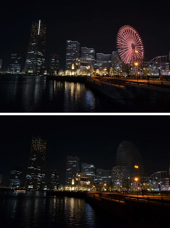 This combo picture shows Yokohama city's landmarks Landmark Tower (L) and a Ferris wheel (R) being submerged into darkness for the Earth Hour environmental campaign in Yokohama, suburban Tokyo on March 29, 2014. International scientists gathered for a week-long meeting of the Intergovernmental Panel on Climate Change (IPCC) Working Group II in Yokohama, centred on a grim climate change report that warned of floods and drought that could stoke conflicts and wreak havoc on the global economy. AFP PHOTO / Yoshikazu TSUNO