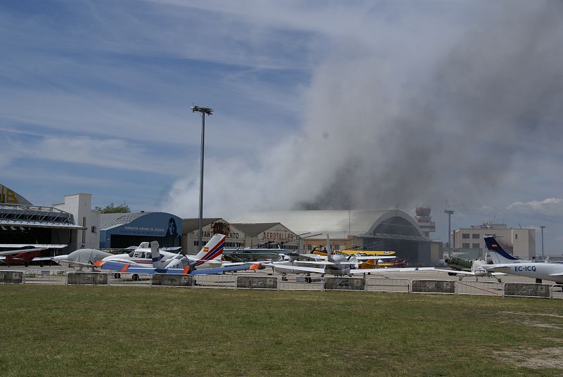 05.05.2013GRA241. MADRID, 05/05/2013.- Operarios de Emergencias pasan junto a los restos de la avioneta de los años 50 que se ha estrellado hoy contra un hangar en el aeródromo madrileño de Cuatro Vientos durante una exhibición. El piloto ha fallecido esta tarde en el hospital de Getafe debido a las quemaduras sufridas en todo su cuerpo. Otras dieciocho personas, entre ellas tres policías nacionales, han resultado heridas de diversa consideración, la mayoría de carácter leve, cinco de las cuales han sido ingresadas en hospitales de la región para realizarles pruebas. EFE/Ayuntamiento de MadridEFE/Ayuntamiento de Madrid -