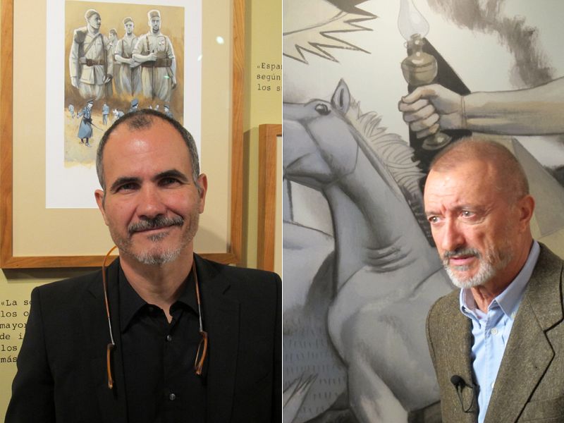 Fernando Vicente y Arturo Pérez-Reverte en la presentación del libro y la exposición de 'La Guerra contada a los jóvenes'