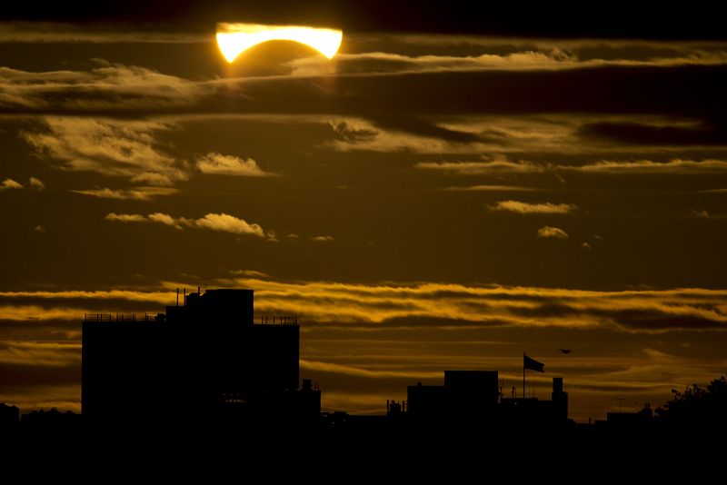 03.11.2013A partial Solar eclipse is seen just after sunrise over the Queens borough of New York across the East River on November 3, 2013 in New York. AFP PHOTO/Stan HONDAImágenes del primer eclipse de sol de 2013
