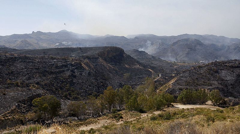 15.07.200915/07/09.- Vista general del parque natural de Sierra Cabrera, en Turre (Almería), en donde medio centenar de efectivos del Batallón de Morón de la Frontera (Sevilla) de la Unidad Militar de Emergencias (UME) participan en la extinción del incendio declarado en la zona, que ha calcinado ya más de 1.500 hectáreas de matorral.EFE/Carlos Barba
