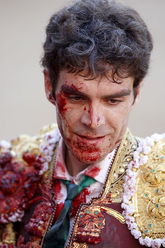16.06.2008MD50. MADRID, 15/06/08.- El diestro José Tomás, con la cara y el traje de luces manchado de la sangre de su enemigo, tras finalizar la faena a su primer morlaco al que le cortó una oreja, durante el festejo celebrado en la plaza de toros de Las Ventas de Madrid, correspondiente a la temporada taurina. Comparte cartel con los espadas José Pedro Prados "El Fundi" y Juan Bautista; y se lidian cuatro toros del "Puerto de San Lorenzo" y dos, que serán cuarto y sexto, de "Toros de Cortés". El matador ha acudido a la enfermería del coso tras estoquear a su primero del que recibió un puntazo en la mano izquierda a causa de una voltereta. EFE/Paco CamposPACO CAMPOS/ EFE -