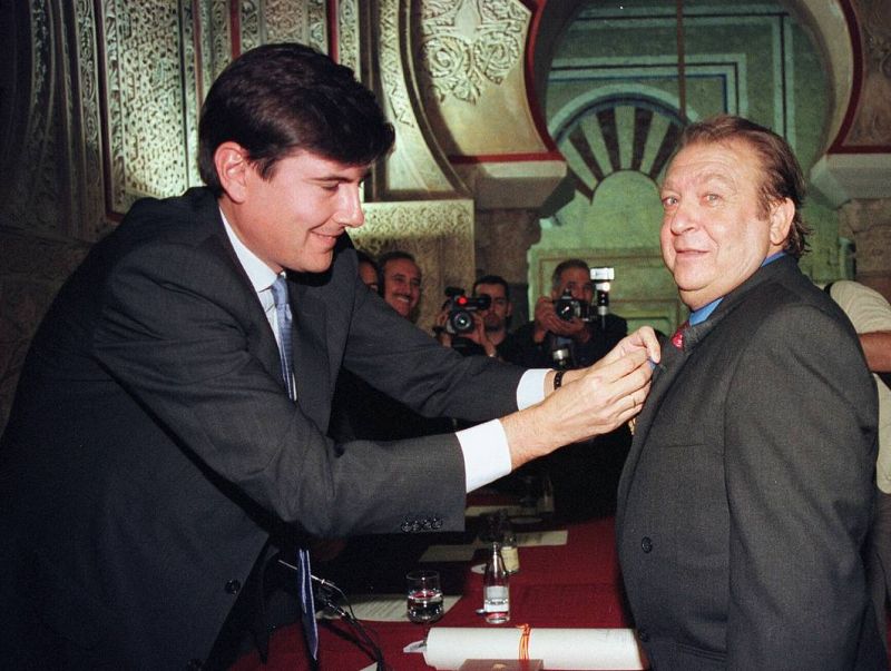 El ministro de Trabajo y Asuntos Sociales, Manuel Pimentel(I), le impone en 1999 al cantaor Juan Peña "El Lebrijano" la Medalla de Oro al Mérito en el Trabajo.