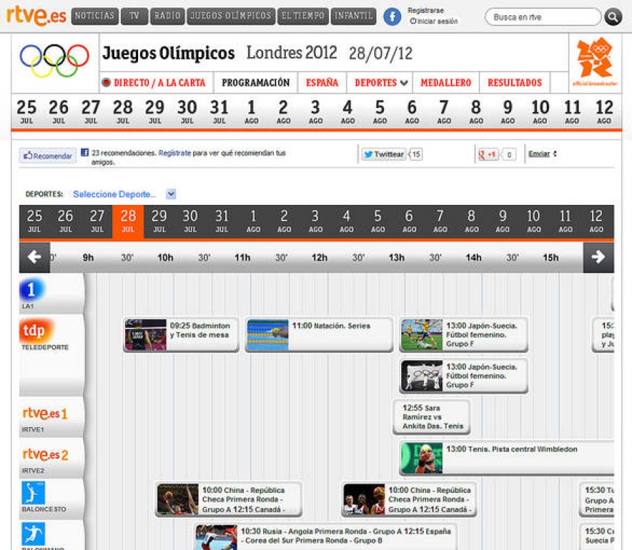 28.07.2012En la pestaña Programación, accede a la parrilla de televisión para conocer qué pruebas se emiten y sus horarios. Pincha sobre cada una de las pruebas para acceder verla en directo.RTVE -