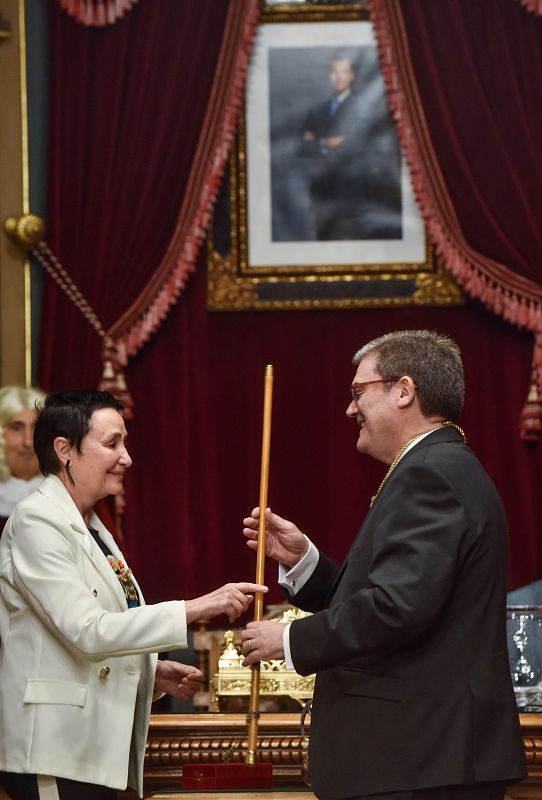15.06.2019La Presidenta de la Mesa de Edad y concejala de EH Bildu en el Ayuntamiento de Bilbao, Jone Goirizelaia (i), ha entregado la makila a Juan Mari Aburto (d), candidato del PNV que ha sido reelegido este sábado alcalde de la capital vizcaína.EFE/Miguel Toña