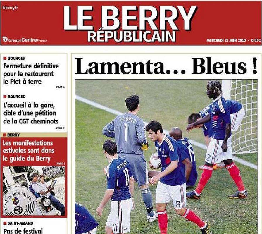 23.06.2010'Le berry républicain' abre con un juego de palabras: "Lamenta... bleus!"rtve