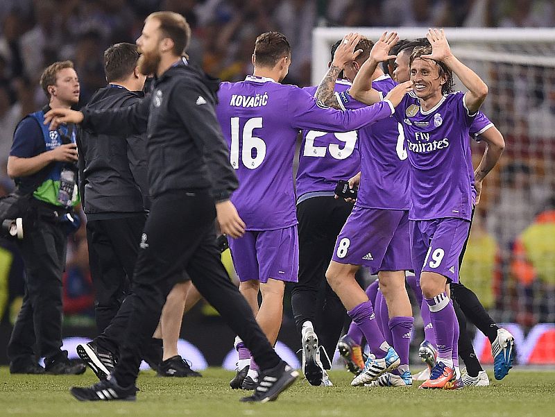 03.06.2017Los jugadores celebran la consecución de la Champions sobre el césped. Los primeros en abrazarse, los croatas Kovacic y Modric.