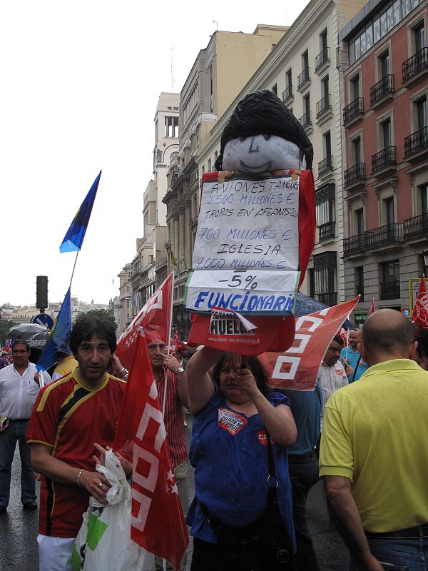 Muchas pancartas de la marcha en Madrid han comparado el recorte de los salarios a los funcionarios con otras partidas de gasto público como la destinada a las tropas en Afganistán o el cupo de la Iglesia Católica.