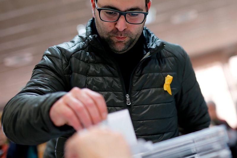 • Un hombre vota con el lazo amarillo que recuerda a los políticos independentistas presos, en Vic. La Junta electoral ha prohibido el uso de este símbolo en los colegios.
