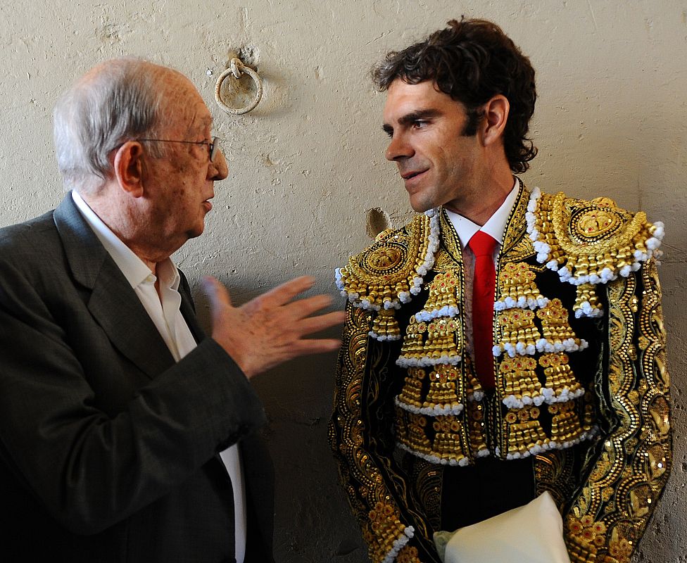 25.09.2011Spanish bullfighter Jose Tomas (R) talks with the owner of Barcelona's Monumental arena, Pedro Balaña (L) on September 25, 2011 in Barcelona's Monumental arena for the last time today before a ban against the centuries-old blood sport comes into effect in Spain's northeastern Catalonia region. AFP PHOTO/ LLUIS GENE.AFP PHOTO/ LLUIS GENE.