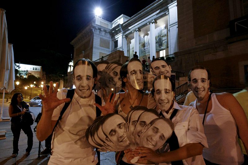 MD74. MADRID, 11/09/2010.- Asistentes al museo del Prado de Madrid, posan con las fotos del "Madrileño del año", elegido por votación popular, durante a La Noche en Blanco que se celebra en la capital madrileña. EFE / Alberto Martín.