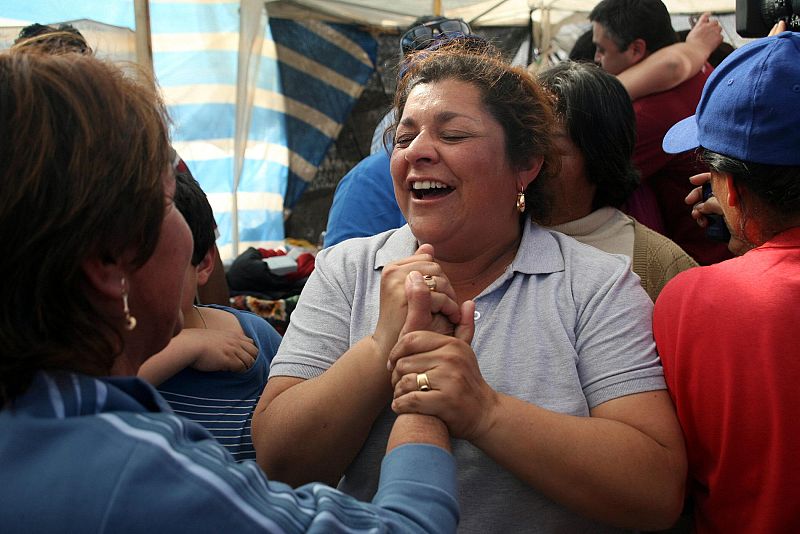 23.08.2010CHI11. COPIAPÓ (CHILE), 22/08/2010.- Familiares de los 33 mineros atrapados celebran hoy, domingo 22 de agosto de 2010, después de saber que los trabajadores de Copiapó (Chile) enviaran una nota a la superficie para certificar que seguían con vida después de permanecer 17 días a 700 metros de profundidad. La nota dice: "Estamos bien en el refugio los 33". EFE/Héctor RetamalEFE/Héctor Retamal -
