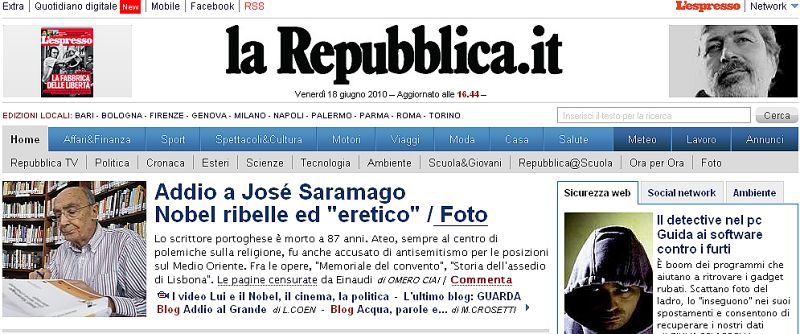 18.06.2010Italia es otro de los países europeos que se ha volcado en la cobertura de la muerte de Saramago. La Reppublica abría así su edición digital.larepubblica.it