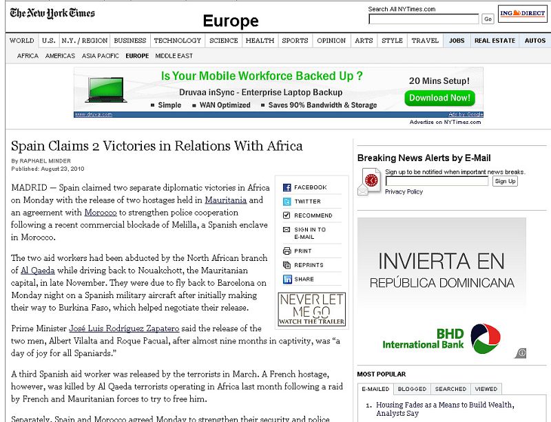 24.08.2010"Los cooperantes españoles son liberados por Al Qaeda en el norte de África" titula la BBC, que lleva ya una fotografía del aterrizaje de madruagada de los cooperantes españoles en Barcelona.RTVE.es -