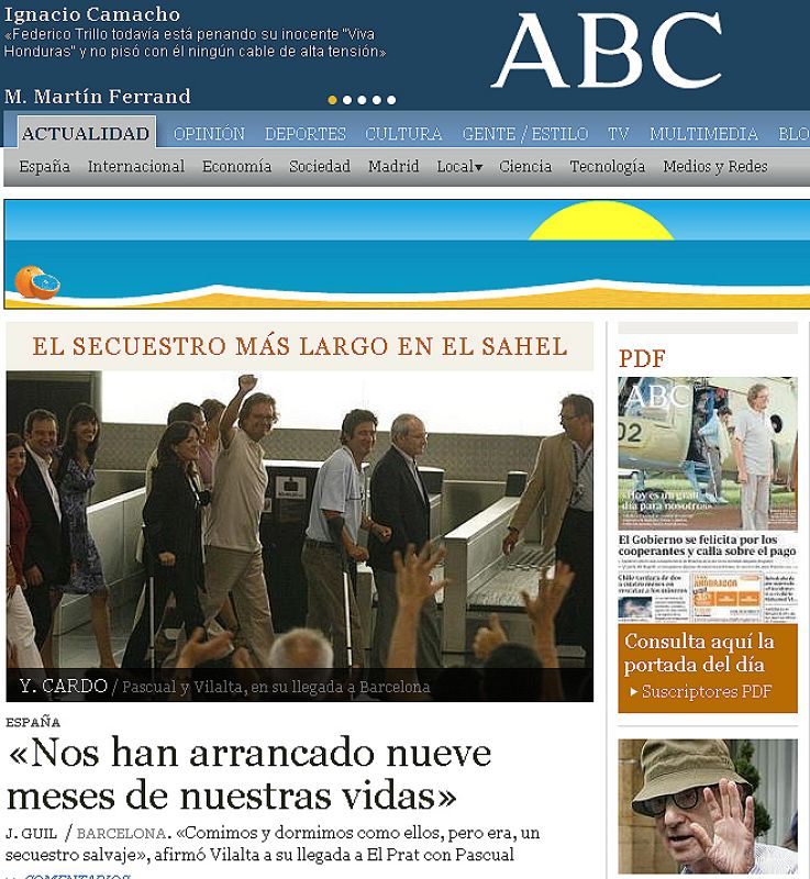 "Los cooperantes liberados por Al Qaeda llegan a España" titula la página web de la cadena estadounidense MSNBC.