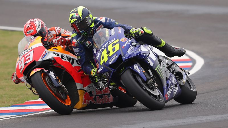 21.10.2018El piloto italiano de MotoGP Valentino Rossi (d), y Marc Márquez (i), del equipo Repsol Honda Team, se tocanen unacurva del circuito Termas de Río Hondo delGran Premio de Argentina,y el italiano se fue al suelo.NA MAG