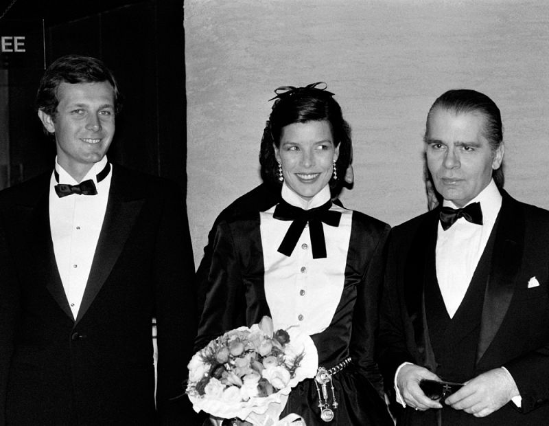 • Carolina de Monaco flanqueada por su marido, Stefano Casiraghi, y Karl Lagerfeld, en el Baile de la Rosa de 1985